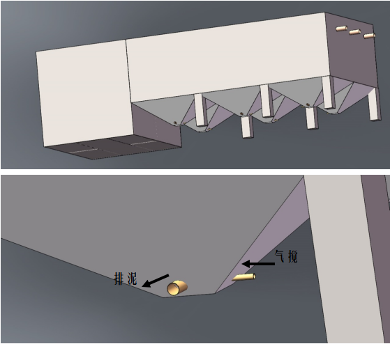 熄焦水處理系統的污泥沉降單元是整套系統的關鍵單元,污泥沉降單元的設計是否合理關系到出水的水質和沉泥的排放是否通暢。 JQ 熄焦廢水處理系統的沉降單元采用錐斗設計,考慮到排泥的通暢,設計上增加了氣攪排泥工藝。